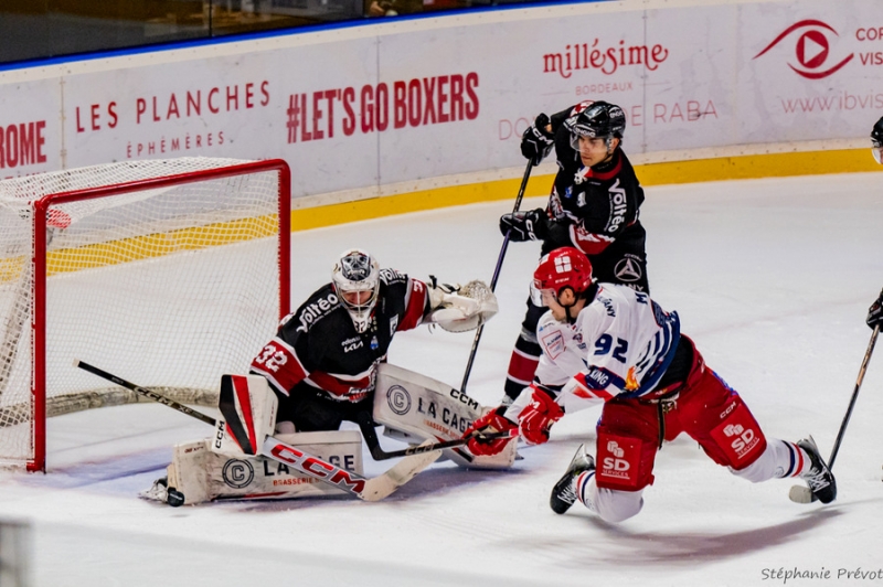 Les visiteurs sont rapidement sanctionnés dans le troisième tiers-temps car Guillaume Leclerc, double buteur dimanche, écope d'une prison pour un cinglage (41'55). Le power-play bordelais donne deux tirs par Emils Gegeris (42'46) après une longue série de passes, puis Samuel Salonen (43'00), sur lesquels Matija Pintaric intervient brillamment. Les Boxers tentent d'égaliser avec tous les moyens dont ils disposent en imposant une grosse domination autour de la cage des BDL. Aina Rambelo bute sur le gardien slovène (44'48). La pression bordelaise s'intensifie au fil des minutes avec un enchaînement d'occasions mais Matija Pintaric et sa défense forment un mur infranchissable... rien ne passe.