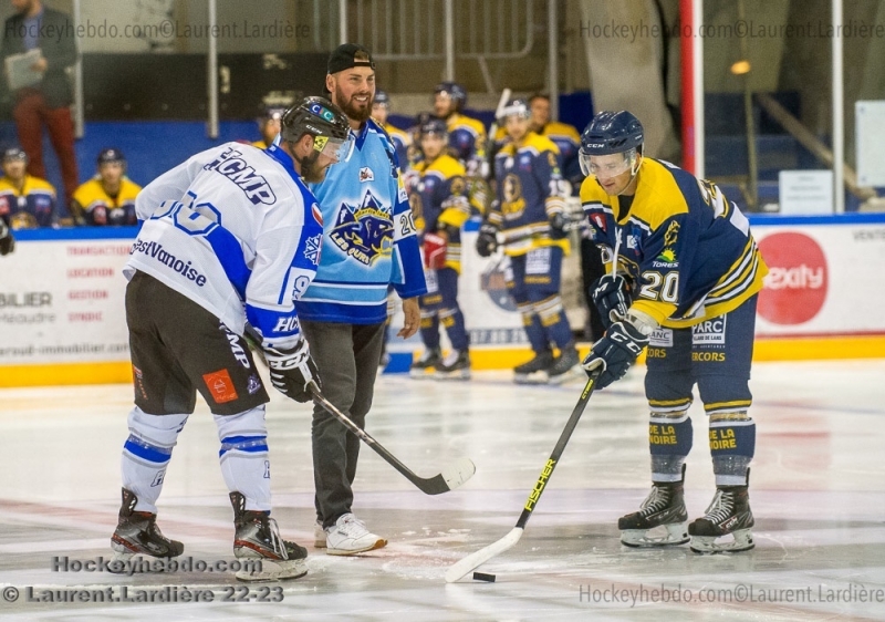 L'ancien Ours, Vincent Couture venu donné le coup d'envoi était grandement applaudi par les spectateurs venus en nombre pour ce deuxième match de préparation à A.Ravix