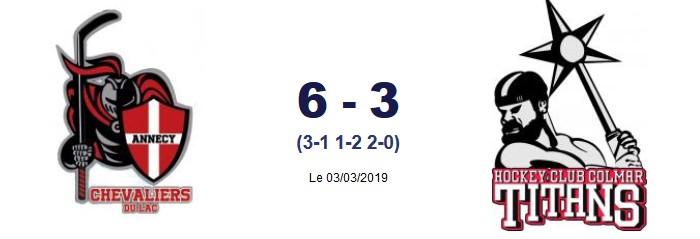 Annecy gagne ce match 5 à 1 et décroche un troisième match le lendemain. Les hommes du match sont le 7 Martin Millerioux pour Annecy et le 10 Maxime Mathieu pour Colmar.
