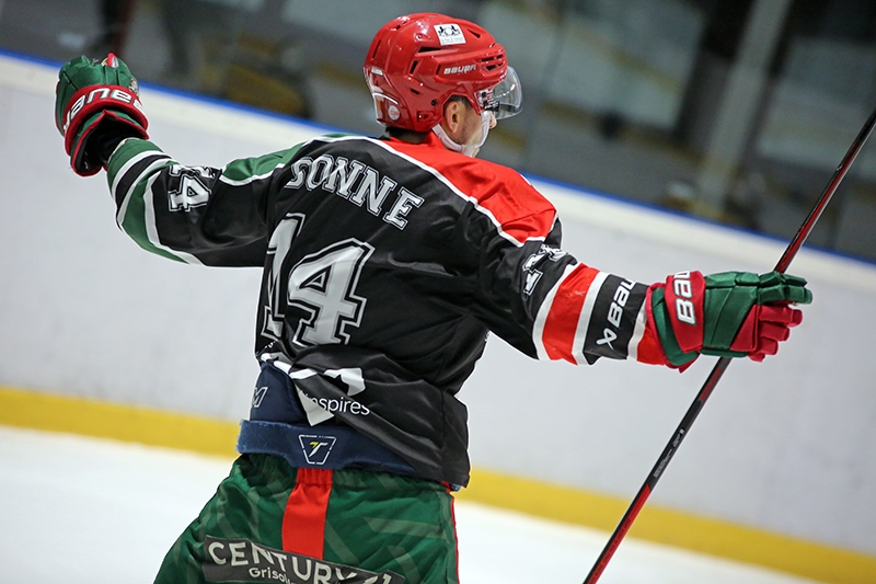 Goy sauve les meubles sur la fin de la situation à 5 contre 3 des savoyards. Cette résistance brillante restera donc sans incidence au score, malgré une nouvelle pénalité rapidement signifiée pour un surnombre, à l’encontre des joueurs de Rémi Peronnard. Madame Boniface avait l’œil et accompagnait Orset au cachot. Une fois encore, le boxplay est actif et résiste aux coups de boutoir. Engagement payant pour les hommes du Palais, qui feront fructifier encore un peu plus leur avantage au score sur le retour au complet. Bicha profite d’une mésentente dans la défense chambérienne pour asséner un tir dont ne pouvait disposer Kogosvek, 3-0. Temps fort local et nouvelle situation dangereuse. Arès se présente seul mais heurte le plastron du cerbère, avant que le capitaine ne soit l’auteur d’une bonne reprise, stoppée par le dernier rempart. Chambéry tente de conserver sa menace, notamment en contre ou sur des palets récupérés en zone d’attaque. Raveaud, puis Navarro s’y essayeront sans parvenir à forcer le verrou. Mont-Blanc repart à 5 contre 4. La pression est forte sur la cage chambérienne, mais le portier et sa défense conservent l’écart. Le retour à 5 est de courte durée pour les Éléphants, qui seront envoyés une nouvelle fois au cachot. Le sortant s’arrête sur la ligne bleue et fait trébucher Numa Besson. 2’ + 2’ sont signifiées contre les protégés de Bergeron. Les Yétis sont dans leur match et récitent leur partition en doublé avantage numérique. Sarlin, au rebond d’un tir initié par Bicha, ajoutait une perle au chapelet en se jetant ventre à terre, 4-0. Les Éléphants traversent une période de tempête. Zabis patiente sur un rebond qu’avait abandonné le cerbère, et Mont-Blanc ajoutait une unité supplémentaire à une addition salée, 5-0. Les jaunes et noirs n’y sont plus. Une nouvelle paire de minutes tombe. Il faudra 55 secondes pour voir le 6ème s’en venir.  | | Alexandre JUILLET | | Sonne auteur d'un superbe but en fin de deuxième | Servi côté droit, Sonne dépose d’un contre foudroyant son vis-à-vis avant de toucher la partie supérieure d’un tir net, 6-0. Ce but scellera un deuxième acte sans partage des Yétis montblanais.