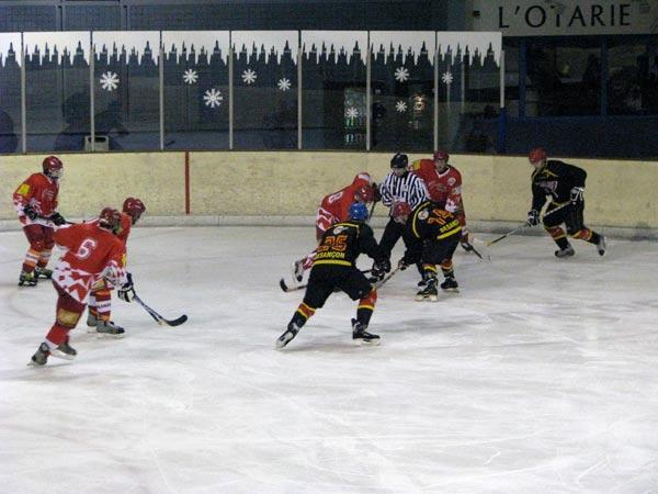 Ce sont des Bisontins dont l’effectif est amputé de ses plus jeunes élements (Creuze, Wendling, Laude…) qui se présentent sur le glaçon. En face, les Valentinois ont fait un long déplacement et ne veulent pas rentrer dans la Drôme les mains vides. Ceux-ci, mettent directement le pressing sur la cage bisontine mais Clerc tient bon.