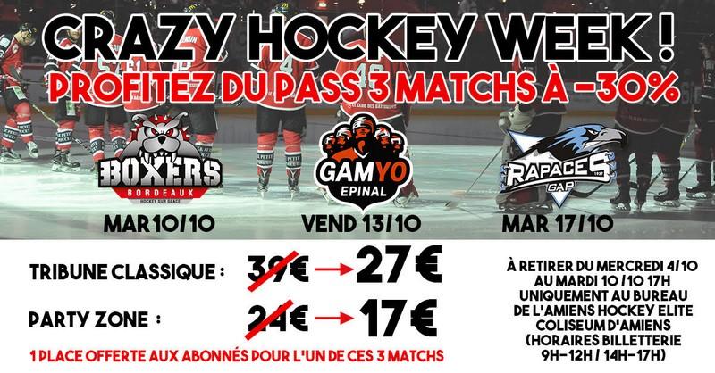Avec pas moins de 5 matchs dont 3 en 7 jours et les difficultés pour les spectateurs de suivre le rythme, notamment d'un point de vue économique, , l'Amiens Hockey Elite met en place un PASS 3 matchs à -30% (27€ contre 39€ initialement en classique et 17€ contre 24 en Party zone)