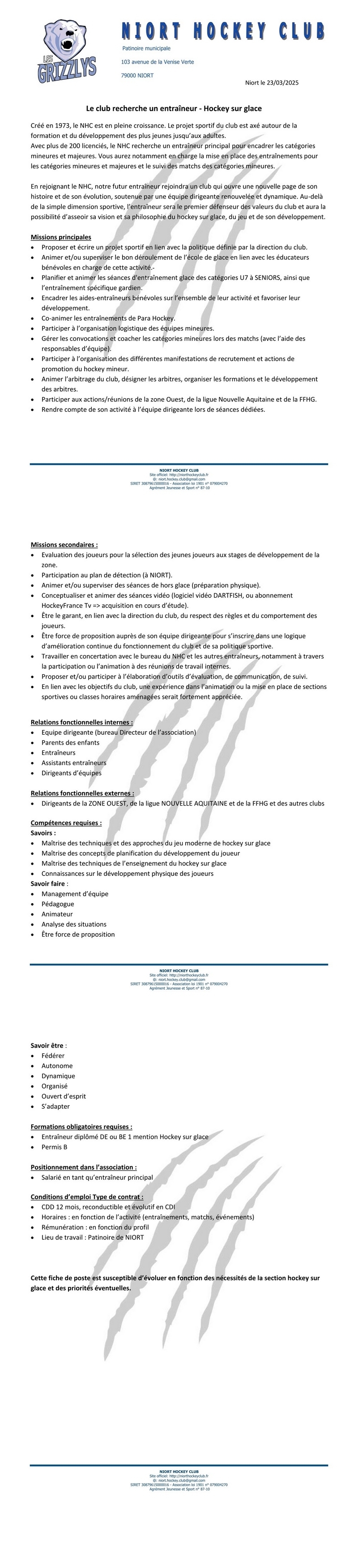 Le Niort Hockey Club recherche son futur entraineur de Hockey Sur Glace à temps plein.